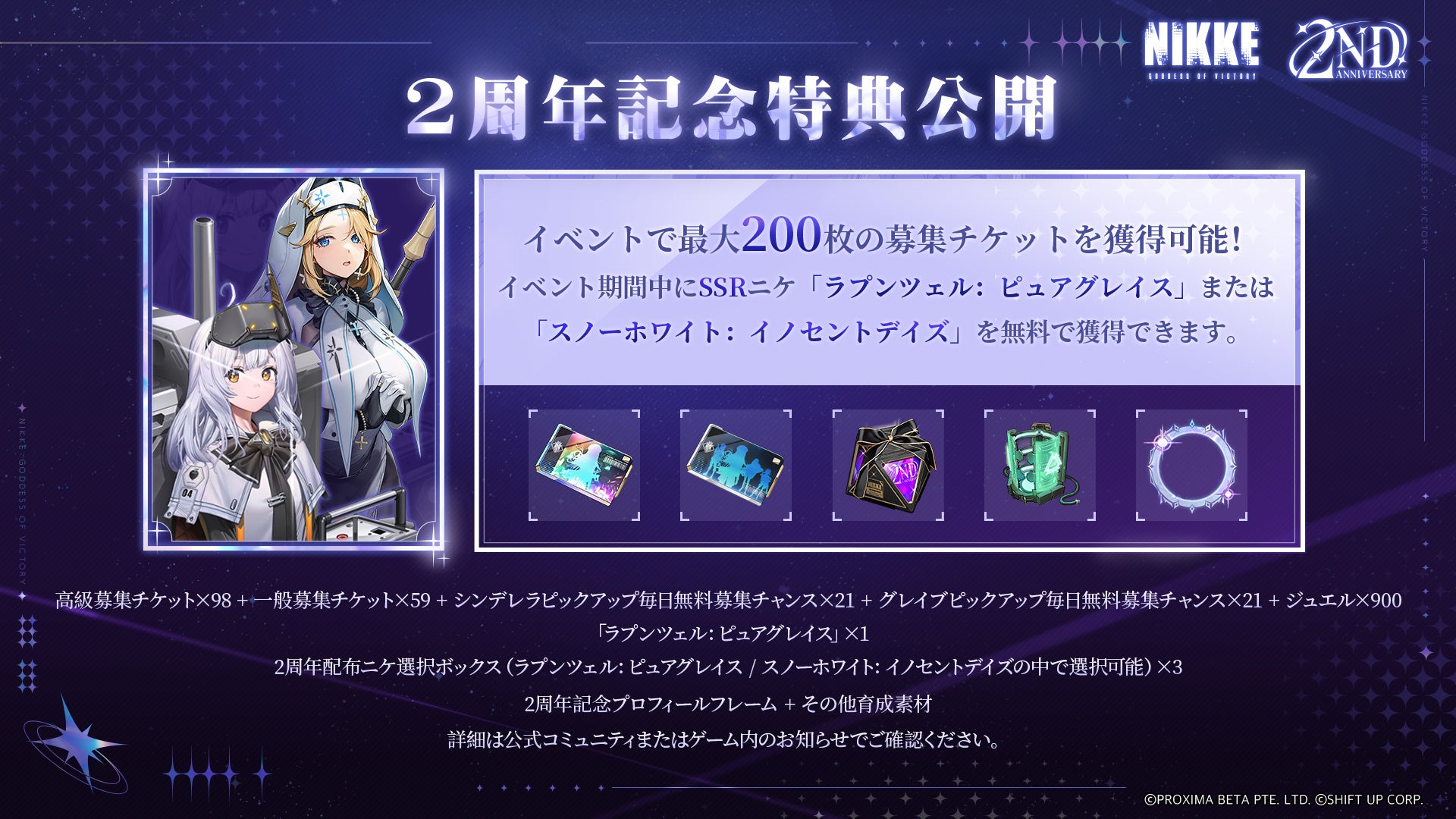 2周年を記念したイベント・企画の詳細については、公式X(旧Twitter)「@NIKKE_japan」や公式サイト、ゲーム内にて随時お知らせいたしますので、この機会に是非フォローをお願いします。