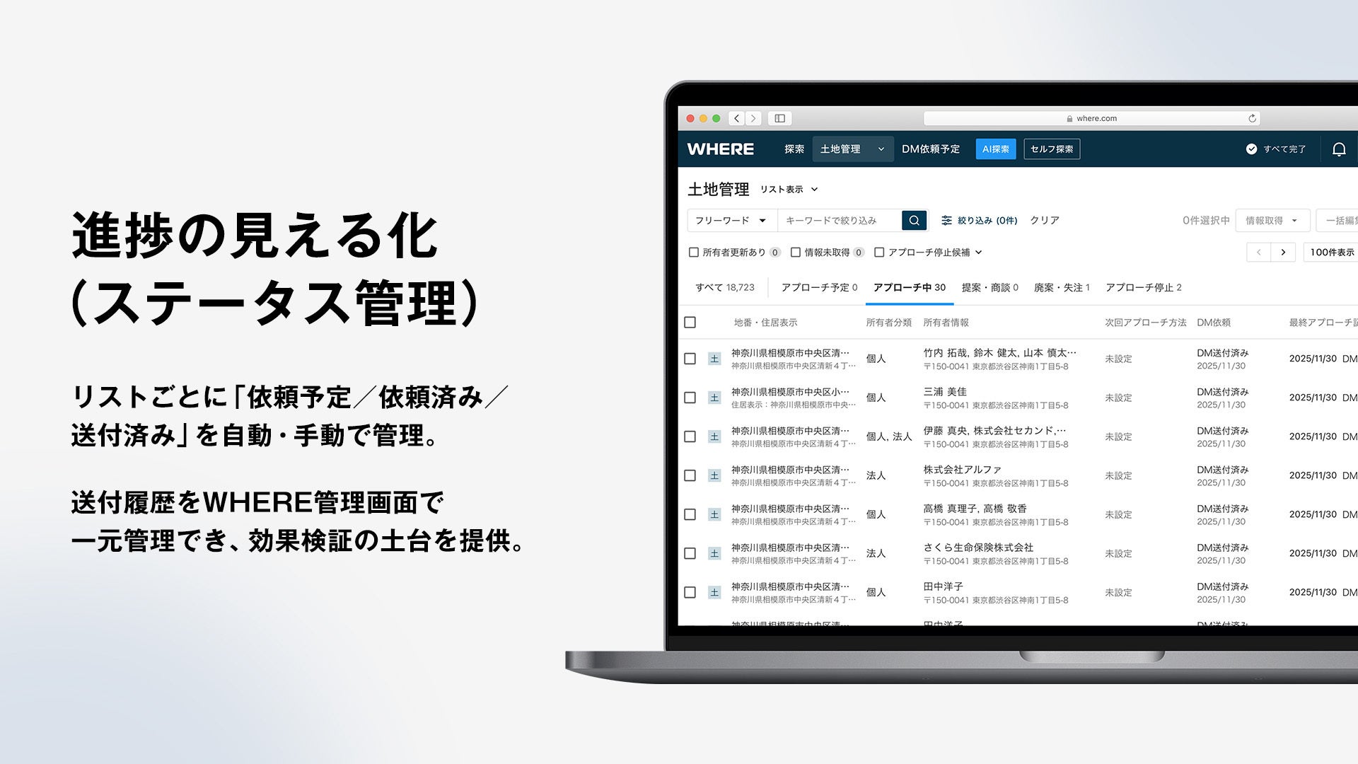 株式会社WHERE(本社:東京都、代表取締役:阿久津 岳生、以下「WHERE」)は、地権者とつながる不動産AIツール『WHERE』において、物件探索からDM送付依頼・進捗管理までをワンストップで行える新機能をリリースしました。