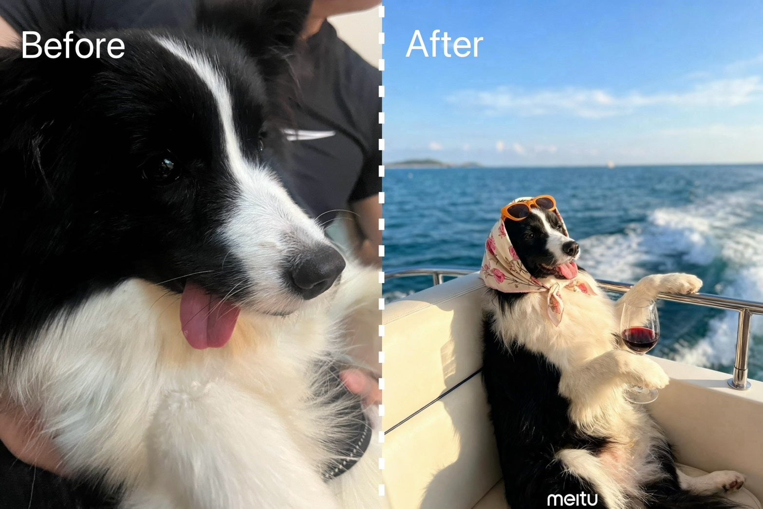 特に今回の「めっちゃバカンス」では、ペットを主役にしたミーム風のビジュアル生成を特徴としており、普段の愛らしい姿が、サングラスをかけてボートでくつろぐ姿や、ドリンクを楽しむ姿などに変換されます。また、人の写真を読み込むと、可愛い動物キャラクターへと変換され、まるで動物になってバカンスに出かけたかのような世界観を楽しむことができます。