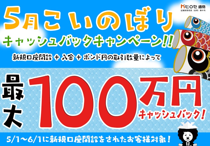 【新規口座開設限定】5月こいのぼり最大100万円キャッシュバックキャンペーン!を実施