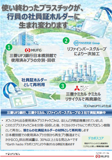 株式会社三菱UFJ 銀行(取締役頭取執行役員 半沢 淳一、以下「三菱UFJ 銀行」)、三菱ケミカル株式会社(代表取締役社長 筑本 学、以下「三菱ケミカル」)、株式会社リファインバースグループ(代表取締役社長 越智晶、以下「リファインバース」)、の3 社は、オフィスから排出される使用済みプラスチックの再利用促進に向けた取り組みとして、三菱UFJ 銀行日本橋別館で発生する使用済みプラスチックの一部(クリアファイル、包装材、緩衝材等)を回収・再資源化し、行員向けの社員証カードホルダーとして再活用する循環スキームの構築に関する覚書を締結しました。本取り組みを通じ、プラスチック原料の国内資源循環を進めることで、環境負荷と資源調達リスクの低減および新たな事業機会創出をめざします。