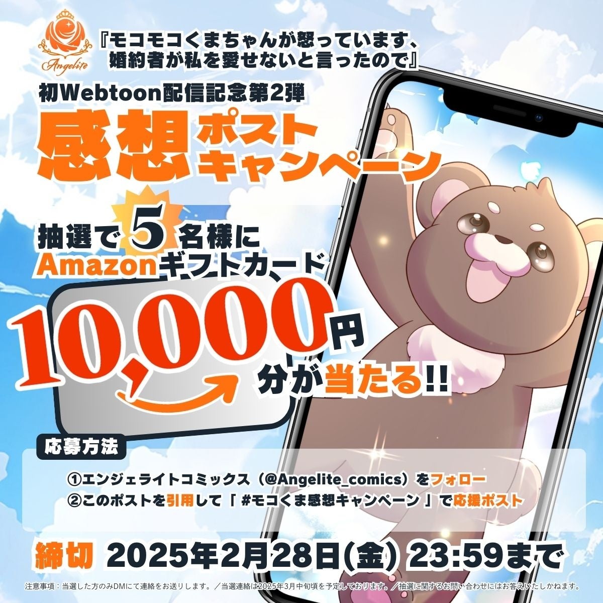 株式会社パルプライド(東京都中央区)は初のタテ読み漫画(Webtoon)作品『モコモコくまちゃんが怒っています、婚約者が私を愛せないと言ったので』の配信記念キャンペーン第2弾として、2月20日(木)より10,000円分のAmazon ギフトカードが5名様に当たる感想ポストキャンペーンを開催いたします。