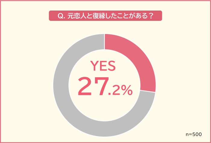 元恋人と復縁したことがある人は27.2%で、少数派でした。復縁しない人が7割以上という結果から、多くの人が一度終わった関係には戻らない選択をしていることがわかります。