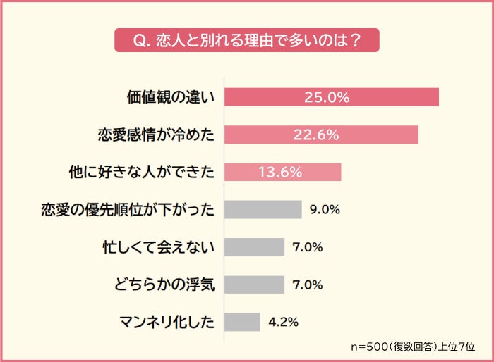 恋人と別れる理由でもっとも多かったのは、1位は「価値観の違い(25.0%)」でした。2位「恋愛感情が冷めた(22.6%)」も多くなっています。