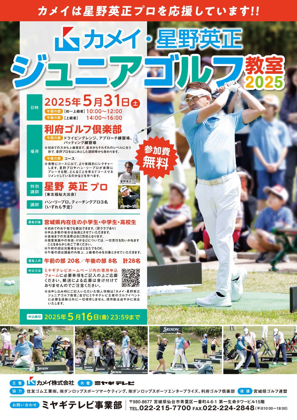 東北を代表するプロゴルファーであり、ジュニア育成にも力を注ぐ星野英正氏による特別指導の場として、「カメイ・星野英正ジュニアゴルフ教室2025」を開催いたします。