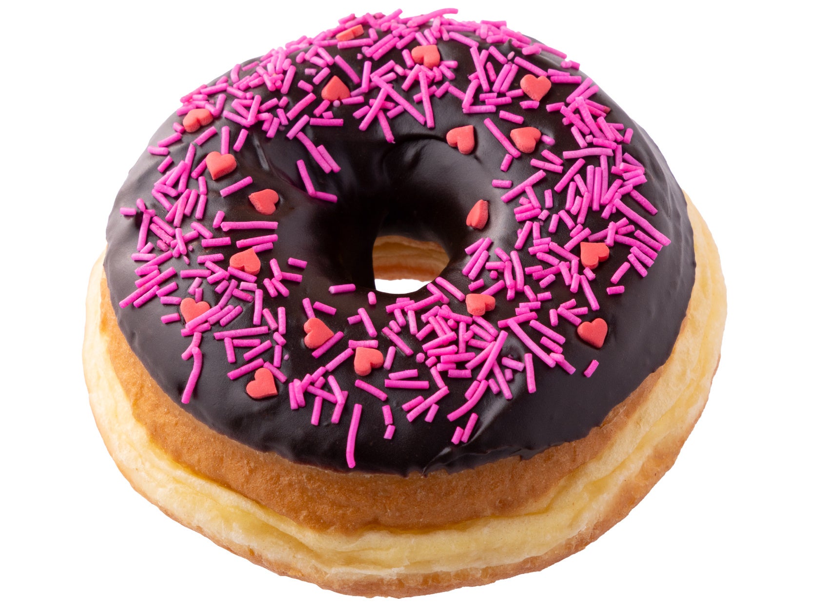 濃厚な甘さのチョコアイシングに赤のハート型とピンクのスプリンクルをトッピングしました。華やかでかわいい見た目が、バレンタインデーのギフトなどにも最適な季節限定ドーナツです。