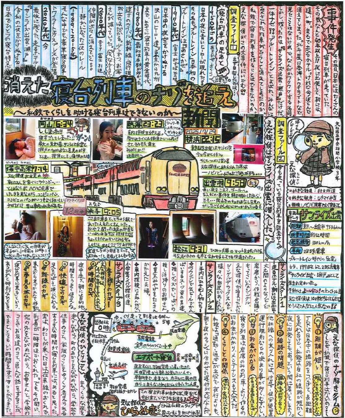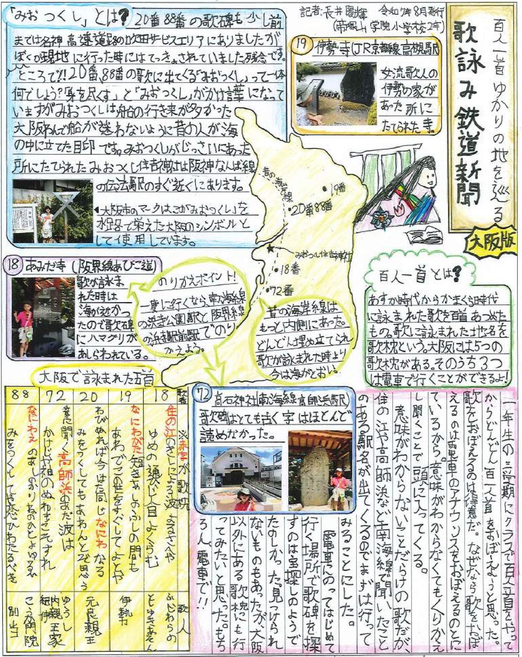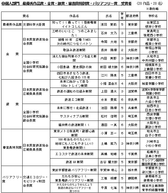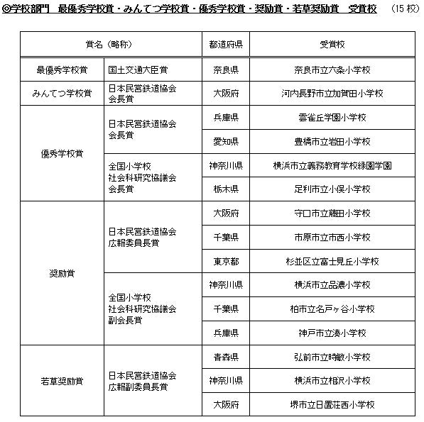 個人部門の最優秀作品賞(文部科学大臣賞)は、東京都 台東区立根岸小学校5年生の浅羽茉莉(あさば まつり)さんの作品「知って!!乗って!!岳南電車イイトコしんぶん」に、学校部門の最優秀学校賞(国土交通大臣賞)は、奈良県 奈良市立六条小学校にそれぞれ決定しました。