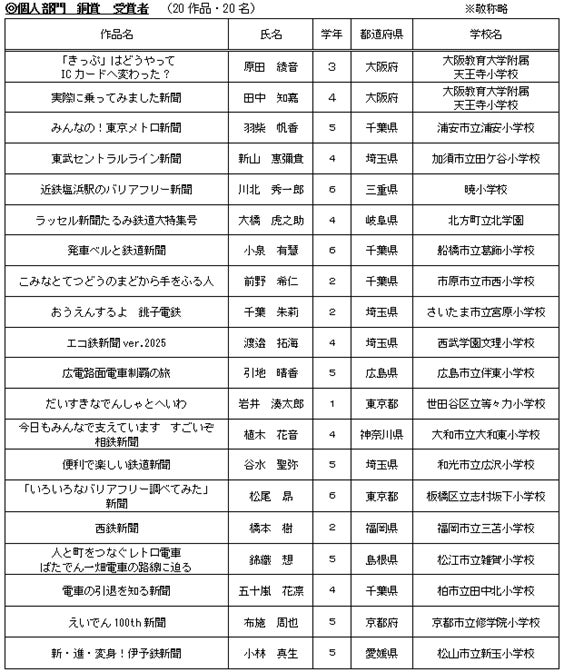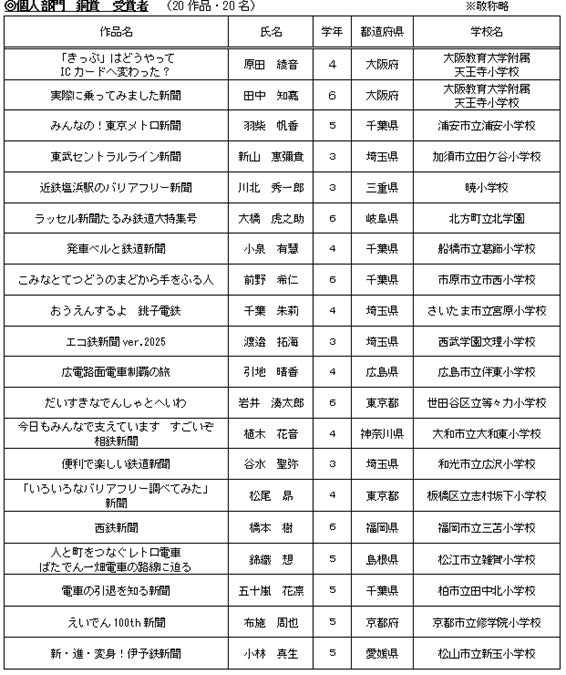 一般社団法人日本民営鉄道協会(事務局:東京都千代田区、会長:杉山健博)は、新聞作りを通じて子どもたちに鉄道に対する関心と理解を深めてもらうことを目的に、第19回「私とみんてつ」小学生新聞コンクールを開催し、このたび、3,099点の応募作品の中から厳正な審査を経て計100作品の受賞者と計41校の受賞校が決定しました。
