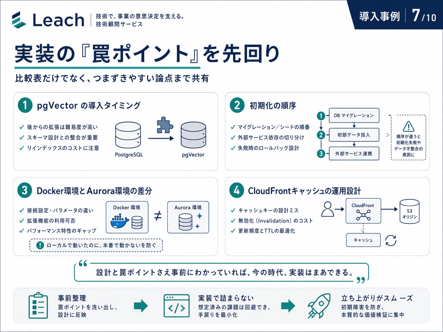 さらに Leach は、比較表だけでなく、実装で実際にハマりやすい論点を事前に共有しました。pgVector の導入タイミング、初期化の順序、Docker 環境と Aurora 環境での差分、そして CloudFront キャッシュの運用設計まで。単なる技術調査ではなく、「実装でつまずく場所まで先回りする」支援になっていました。