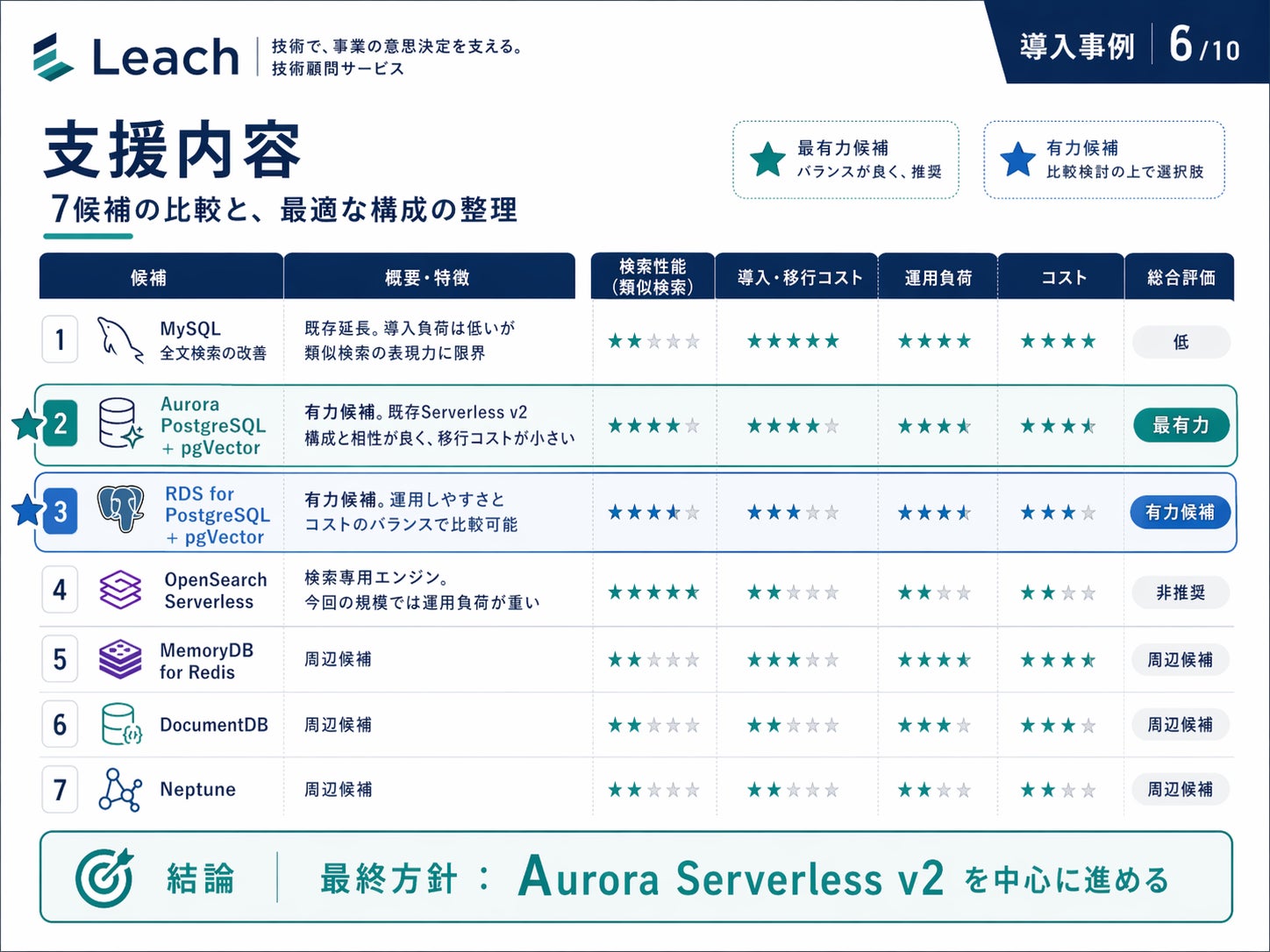 有力案として整理されたのは PostgreSQL + pgVector。さらに Aurora PostgreSQL と RDS for PostgreSQL の両方を並べ、どちらを採るかの判断基準まで提示しています。最終的には、既存 MySQL が Aurora Serverless v2 で動いていたこと・コスト感・移行のしやすさを踏まえ、Aurora Serverless v2 を中心に進める方針で着地しました。