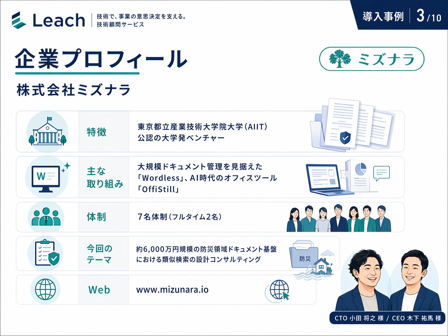 日本最大級の自治体における防災ドキュメント基盤 ── 約6,000万円規模・3年契約の案件で、数千ページの文書に対する「類似検索」をどの技術で実現すべきか。専任アーキテクトを雇うほどではない、でも社内だけでは決め切れない。この隙間を埋める形で、株式会社ミズナラは Leach 生成AI顧問を活用しました。CTO 小田 将之 様、CEO 木下 祐馬 様にお話を伺います。