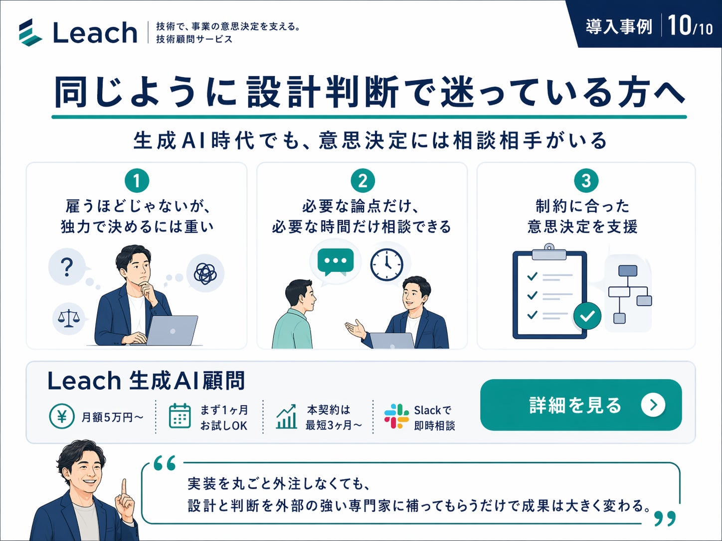 「雇うほどじゃないが、独力で決めるには重い」── 中小規模の開発チームで頻出するこの局面に、Leach 生成AI顧問は月額5万円〜、まず1ヶ月お試しから入れます。