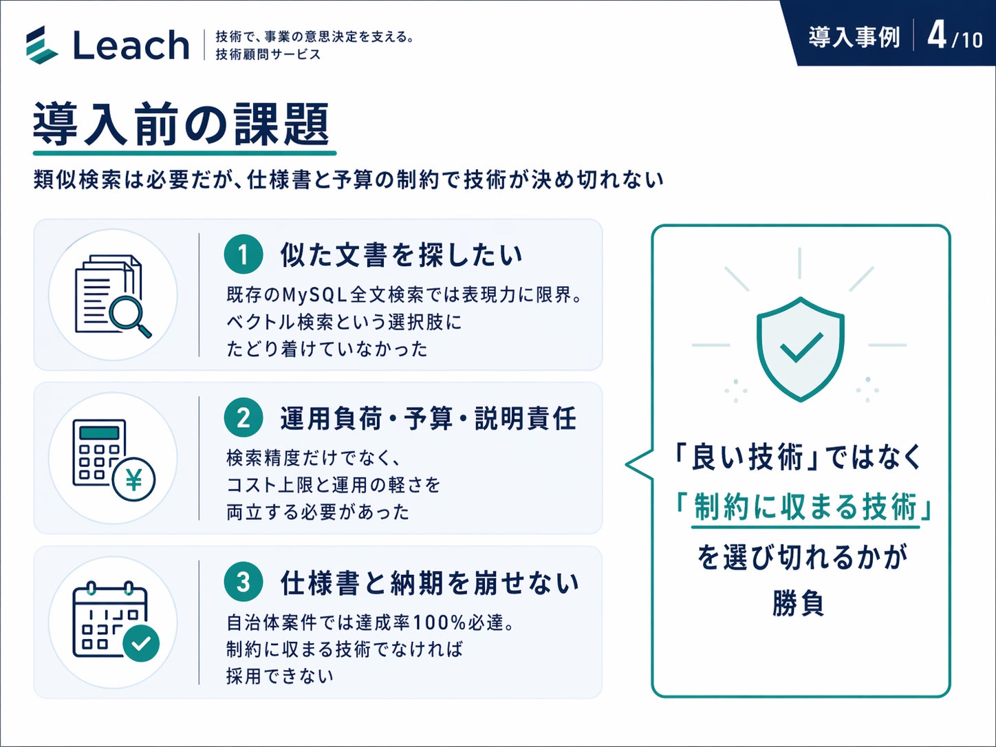 2. 導入前の課題 ── 類似検索は必要だが、仕様書と予算の制約で技術が決め切れない