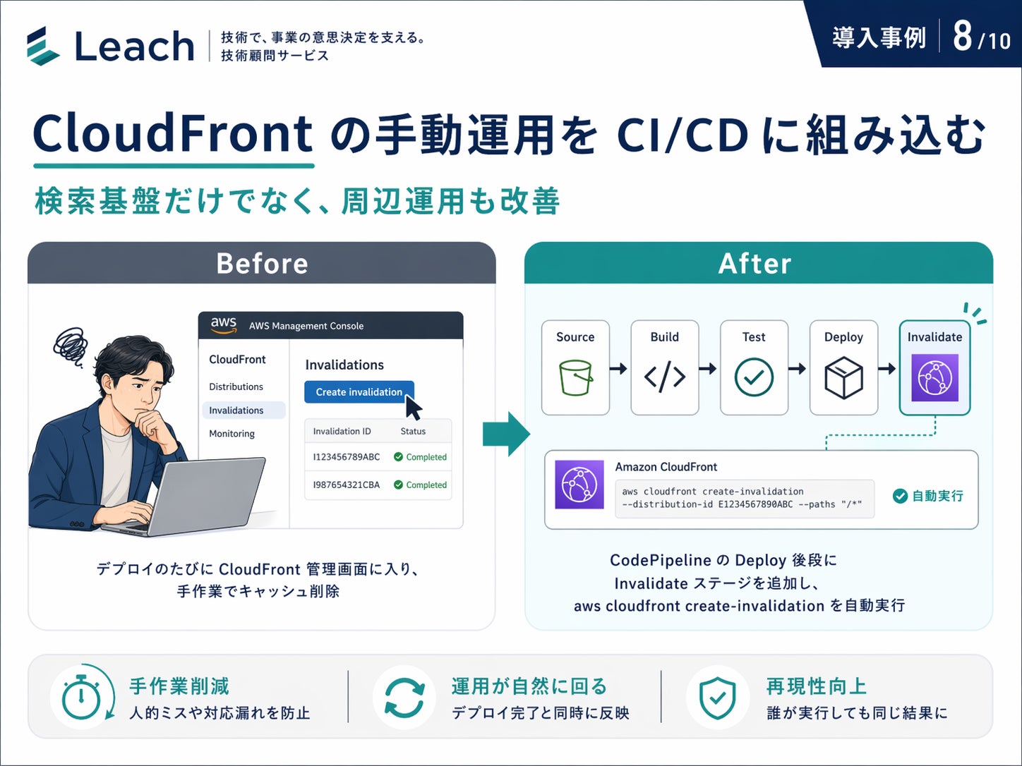 支援は検索基盤だけにとどまりませんでした。デプロイ後の CloudFront キャッシュ削除についても、運用改善の提案が行われています。