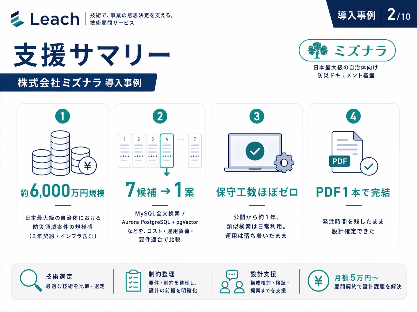 ※本記事で紹介する防災領域の取り組みには、ミズナラの前身体制で行われたプロジェクトを含みます。本文中の約6,000万円規模という記載は、当該取り組み全体(インフラを含む)の規模感を示したものであり、Leach の顧問料や保守契約の金額を指すものではありません。公開上の配慮から、顧客名や一部の固有情報は伏せて記載しています。
