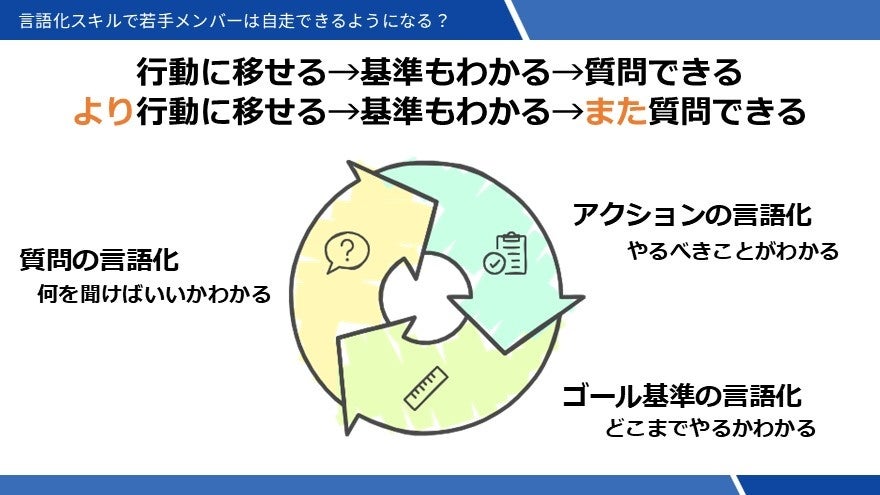 言語化スキルを身につけた若手メンバーは、自律的に動くことができるため、リーダー層はより高次元の仕事に注力でき、結果的に企業全体が成長できると提言しています。