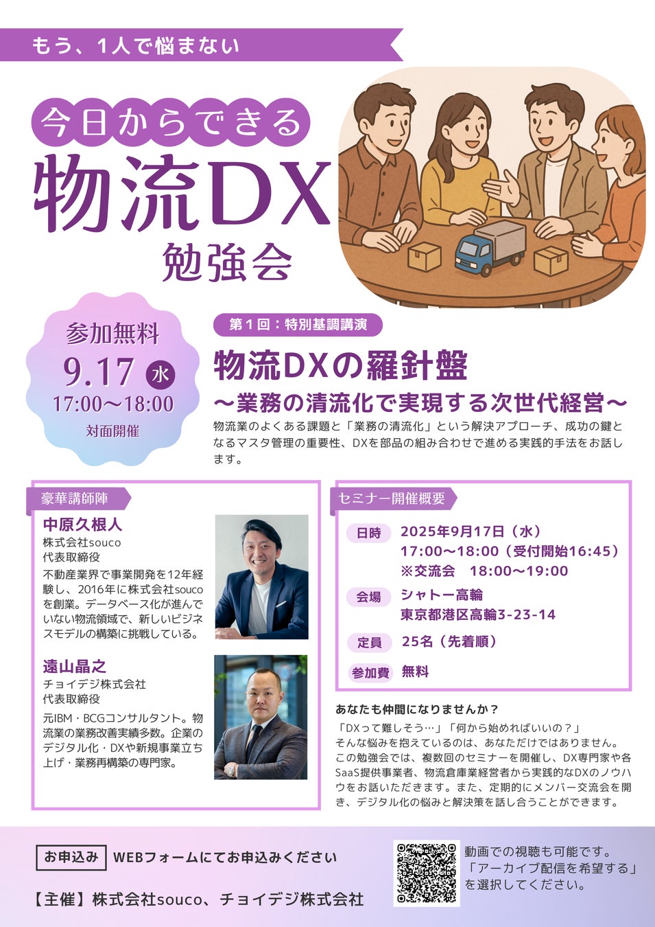 9月17日開催『今日からできる物流DX勉強会』基調講演のお知らせ ~株式会社souco代表取締役 中原久根人氏が語る「物流DXの羅針盤 業務の清流化で実現する次世代経営」~
