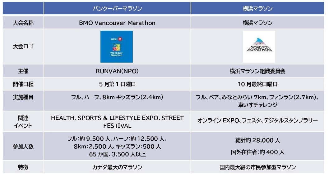 (1) 目的 横浜市とバンクーバー市の姉妹都市関係を基礎として、両市のマラソン大会の連携を通じ、運営に関する知見の相互活用及び人的・文化的交流の促進を図ることにより、両大会の一層の魅力向上と国際的な認知度の拡大を図ることで、持続可能かつ質の高い大会運営の確立に資することを目的とする。