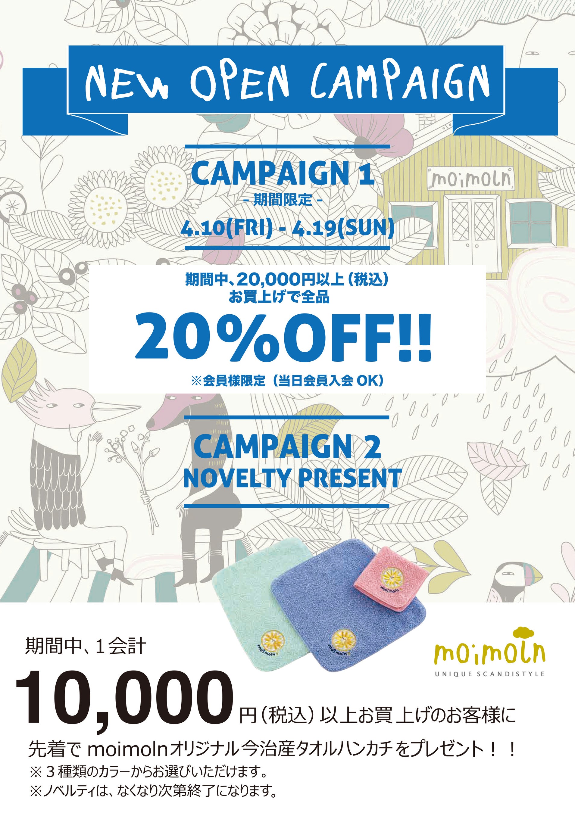 さらに、オープン初日から4月19日(日)までの期間限定で、商品合計税込20,000円以上ご購入のお客様を対象に、20%OFFとなるオープン記念キャンペーンを実施いたします。