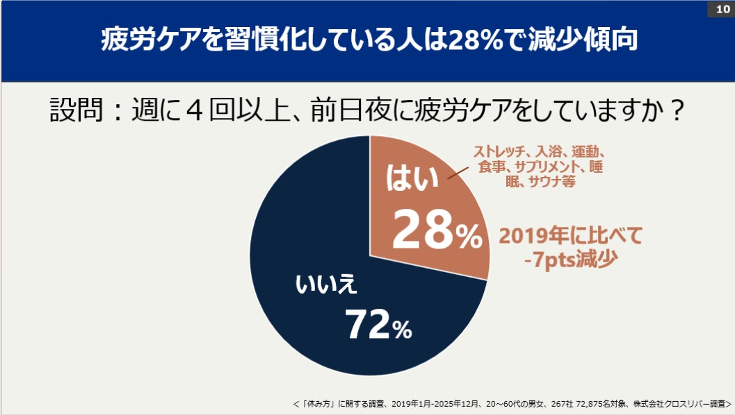 これほど効果があるにもかかわらず、週4回以上の疲労ケアを習慣化できている人は全体のわずか28%にとどまりました。