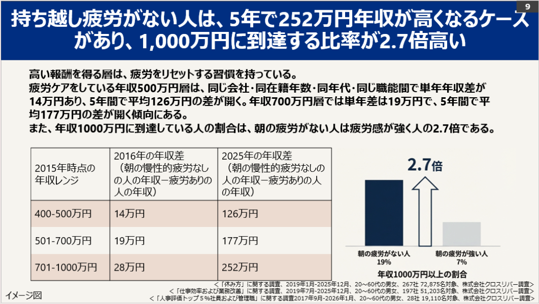 朝の疲労感がない従業員は、同年代と比較して昇進・ 昇格が平均1.6年早いことが判明しました。管理職に抜擢される確率も1.7倍高くなっています。さらに年収への影響を試算したところ、5年間で最大252万円の差(年収701〜1,000万円層の比較)が生じているほか、年収1,000万円に到達する確率も2.7倍高いという衝撃的な結果となりました。
