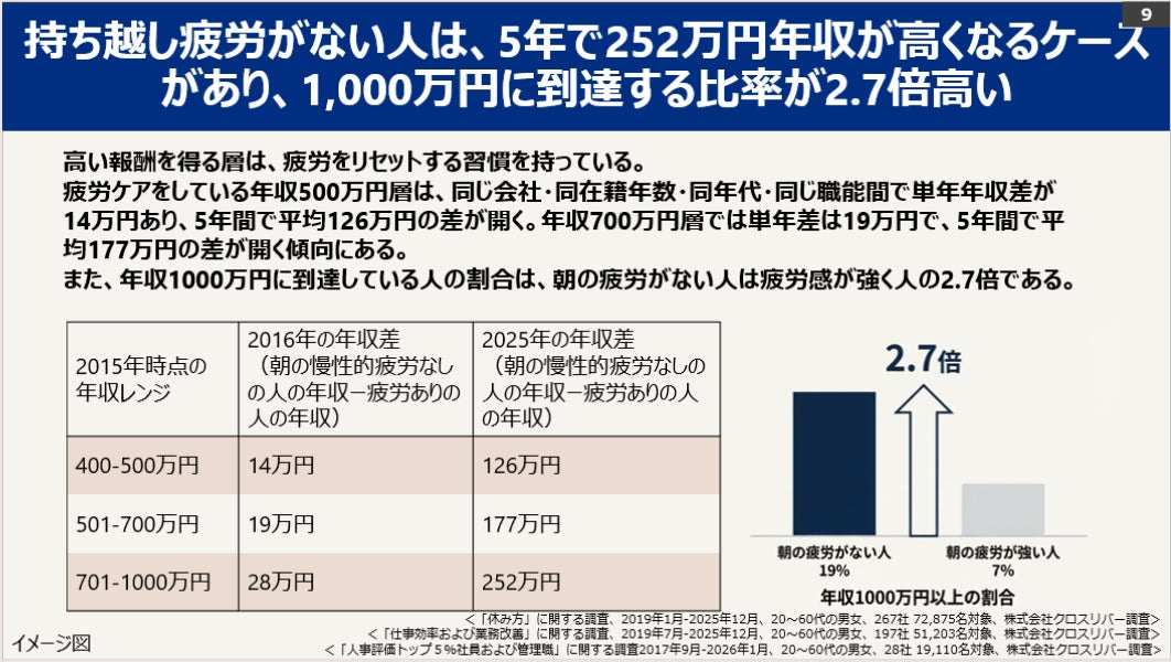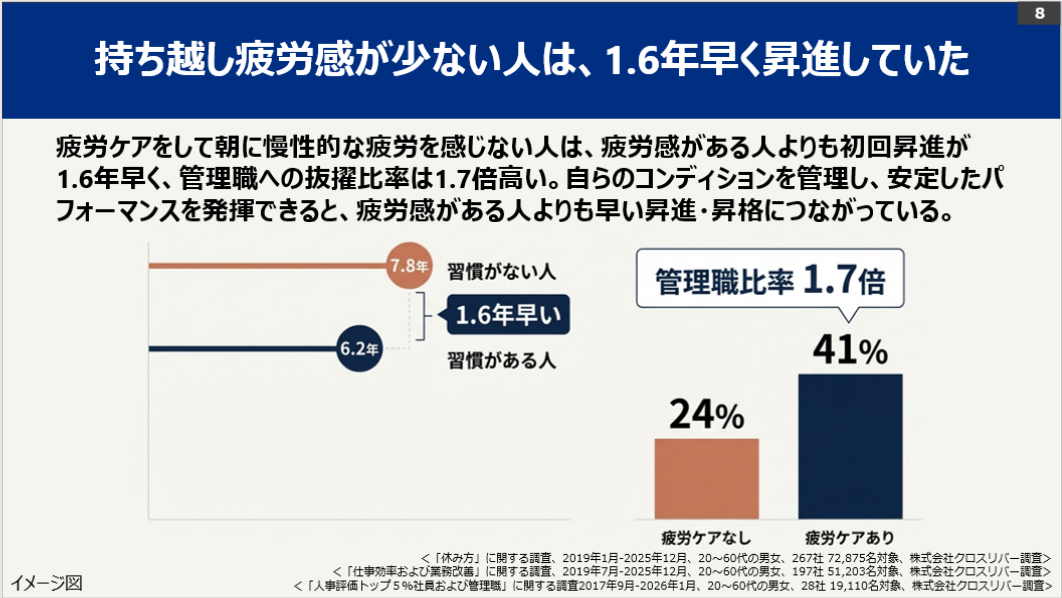 4月からのスタートダッシュを成功させ、充実したキャリアを築くためには、前日の疲れを翌日に持ち越さないための疲労ケア「ナイトルーティン」が極めて重要です。当社は本調査結果を通じ、朝の持ち越し疲労が頑張る現代人のキャリアや収入にどのような影響を与えているのかを明らかにしました。
