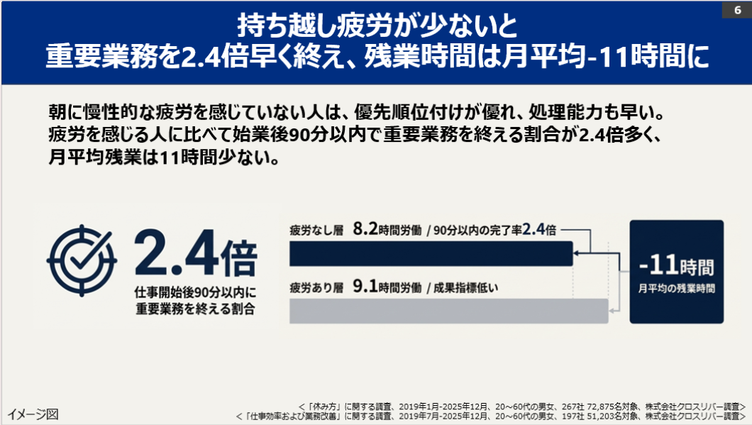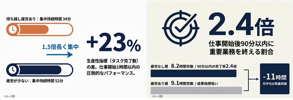 ・朝の持ち越し疲労がない人は、午前中の集中継続時間が1.5倍長く、タスク完了数が23%増加します。