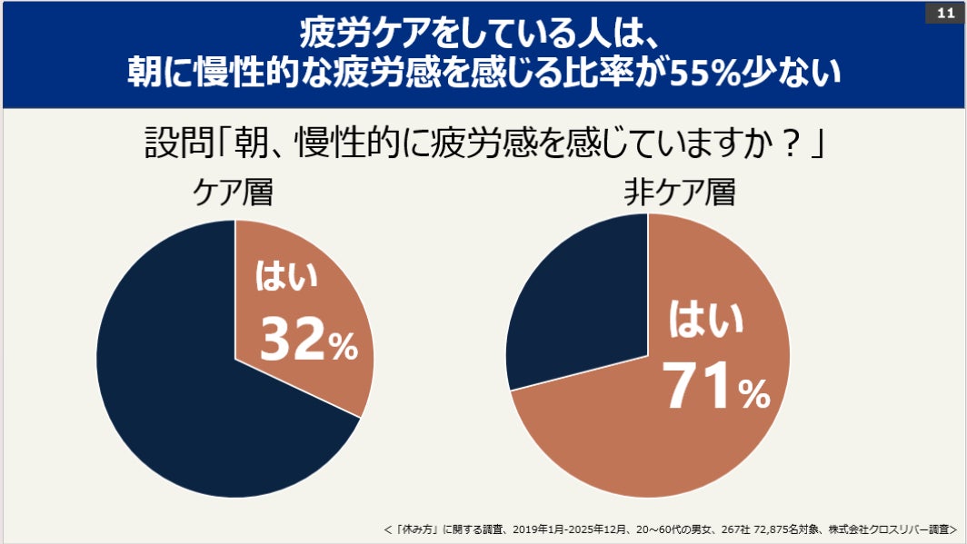 ・週4回以上の疲労ケア習慣がある人は、朝の疲労感が55%少ない傾向にあります。