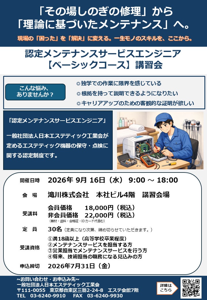 一般社団法人日本エステティック工業会(所在地:東京都、理事長:瀧川睦子)は、エステティック機器の安全性およびサービス品質の向上を目的として、2026年度「認定メンテナンスサービスエンジニア【ベーシックコース】講習会」を開催いたします。