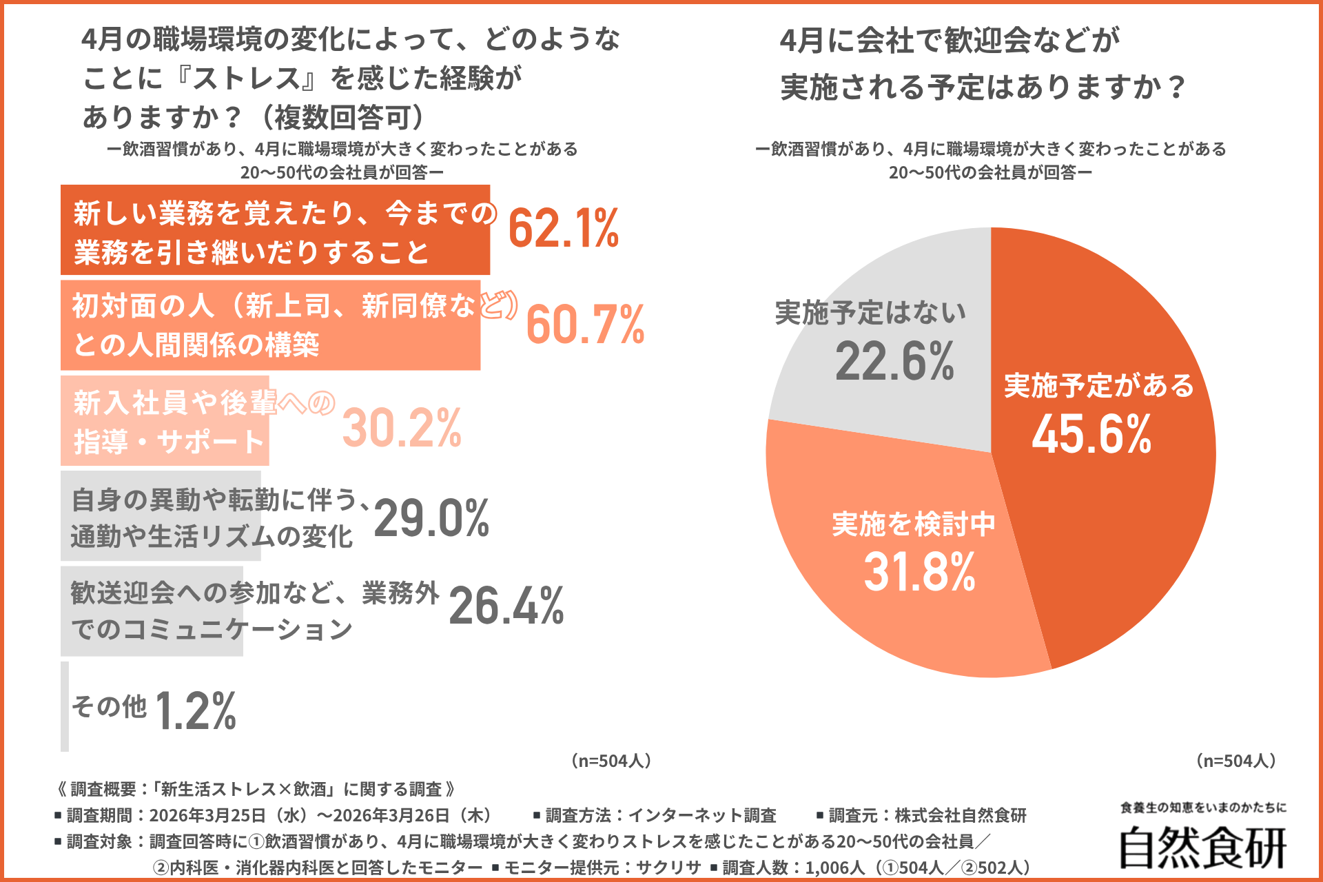 株式会社自然食研(所在地:大分県豊後高田市、代表者:佐々木 興平)は、①飲酒習慣があり、4月に職場環境が大きく変わりストレスを感じたことがある20〜50代の会社員/②内科医・消化器内科医を対象に、「新生活ストレス×飲酒」に関する調査を行いました。