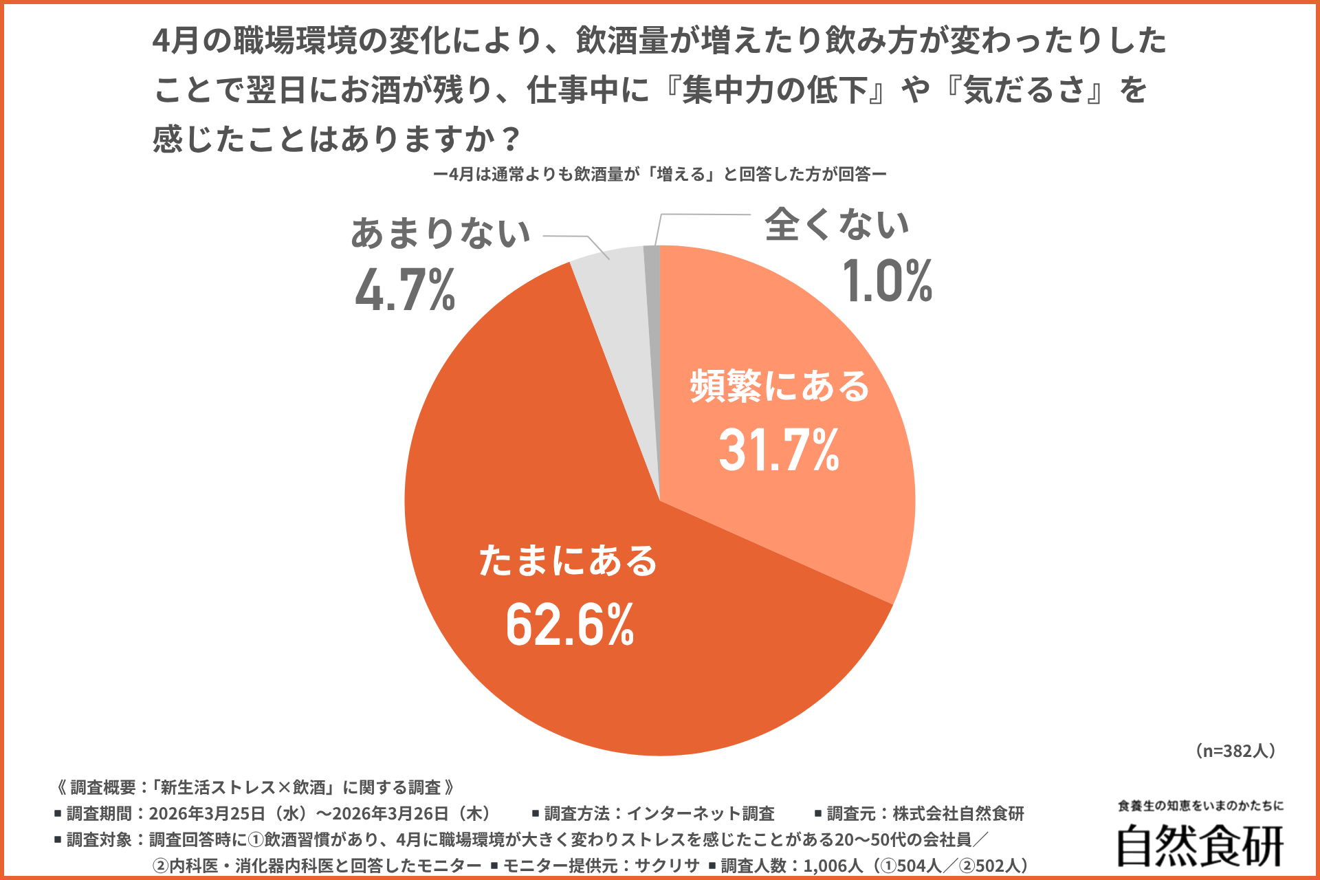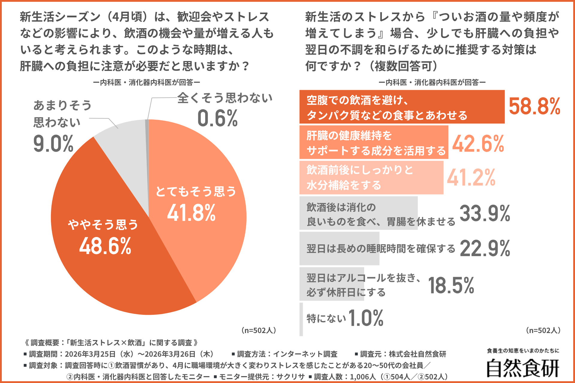 そこで今回、株式会社自然食研(https://www.sizenshokken.co.jp/)は、①飲酒習慣があり、4月に職場環境が大きく変わりストレスを感じたことがある20〜50代の会社員/②内科医・消化器内科医を対象に、「新生活ストレス×飲酒」に関する調査を行いました。