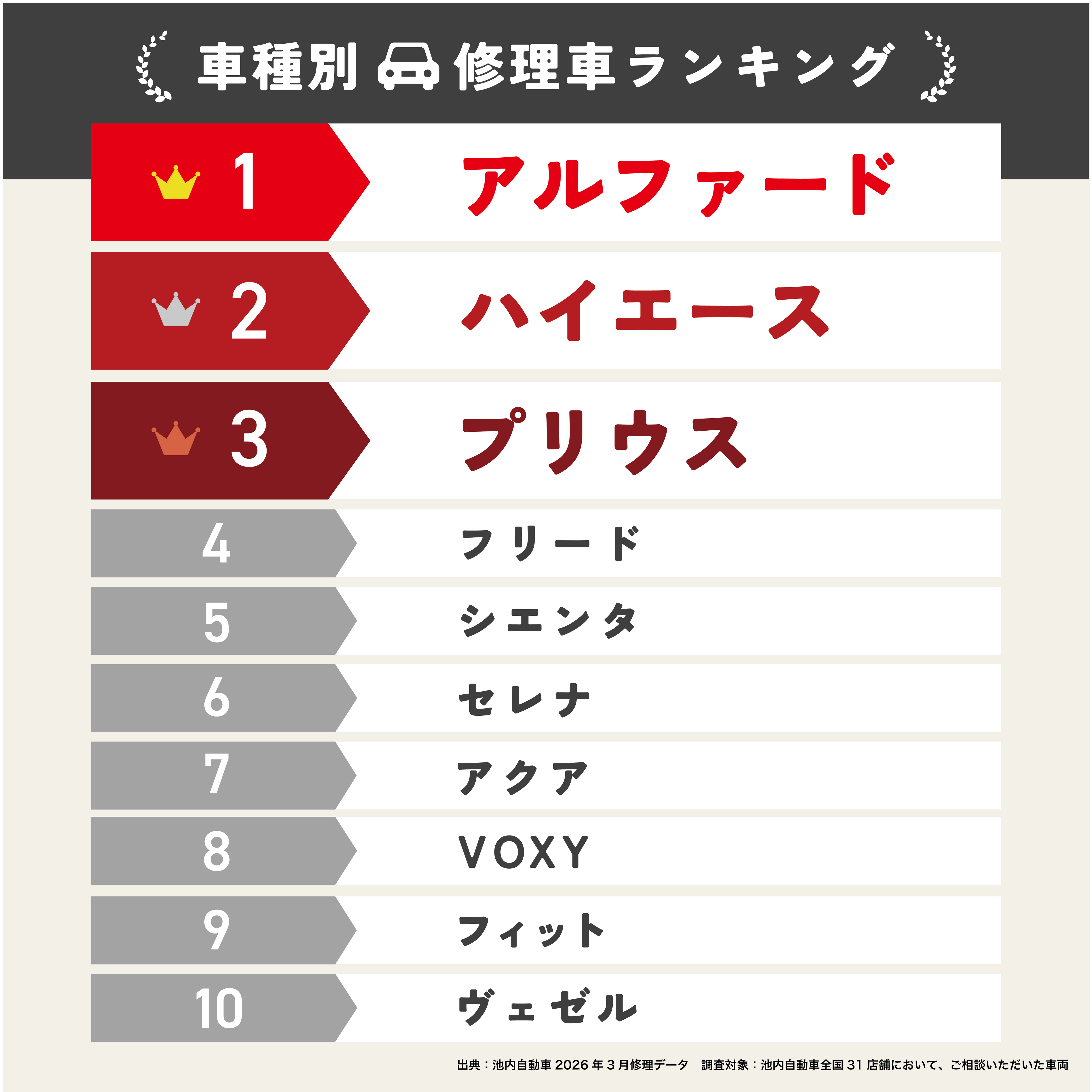 【2026年3月】車種別 修理車ランキング トップ10