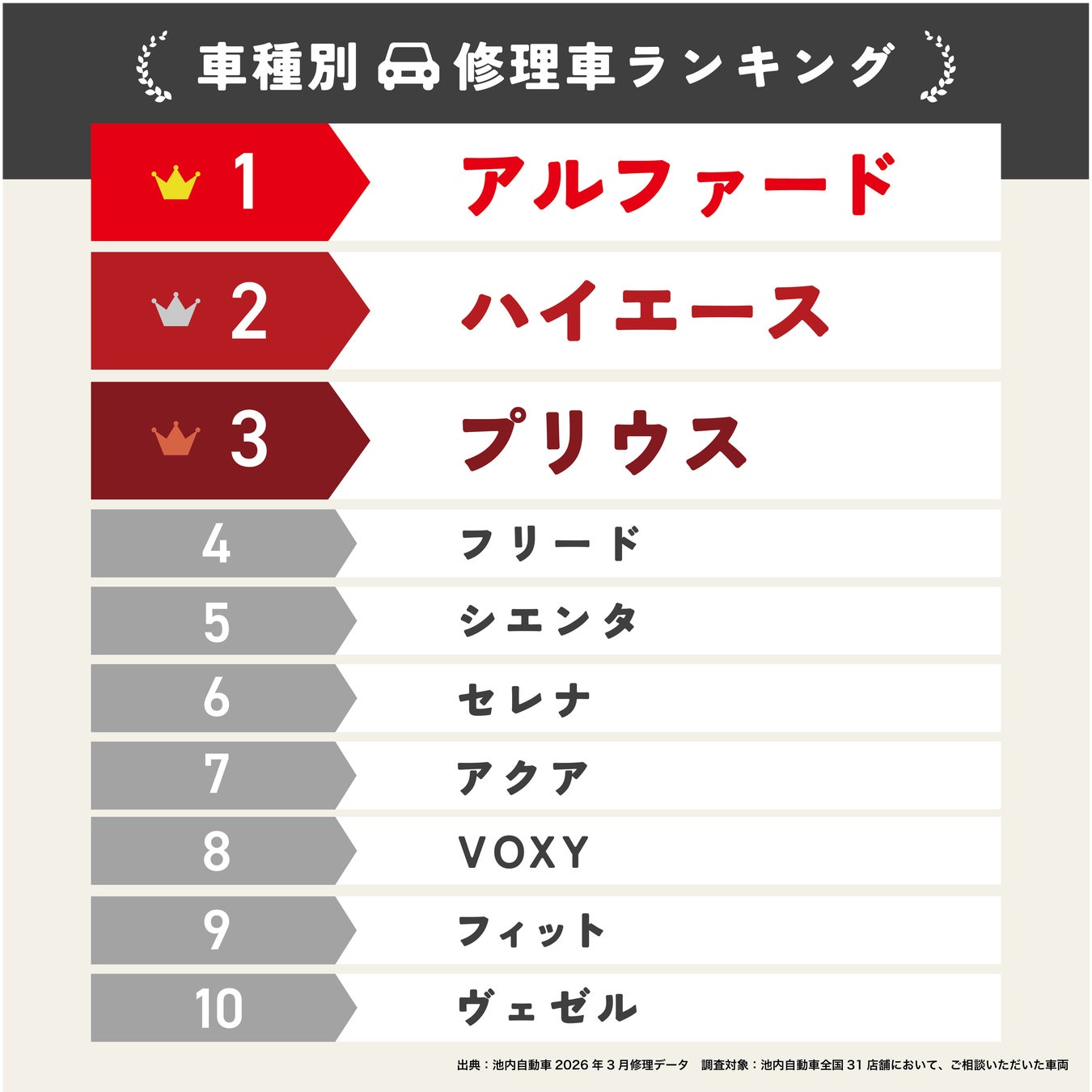 自動車の板金塗装事業を手掛ける株式会社イケウチ(本社:東京都千代田区、代表取締役社長:池内 美友、以下「当社」)は、自社店舗における2026年3月の修理データを集計し、「車種別 修理車ランキング」および春季の自動車修理トレンドに関する実態調査を発表いたしました。