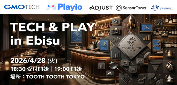 株式会社PLAYIO(代表取締役:ホ・ジョンフィ、以下「PLAYIO」)は、2026年4月28日(火)にGMO TECH株式会社(代表取締役社長:鈴木亮一、以下「GMO TECH」)と共同で、ゲームおよびアプリ業界のマーケターを対象とした交流イベント「TECH & PLAY in Ebisu」を開催する。
