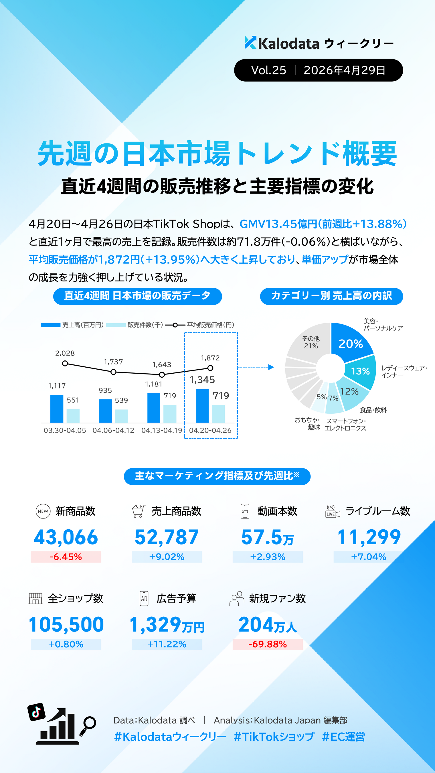 【Kalodataウィークリー】日本TikTok Shop市場、GMV13.45億円で直近1ヶ月の最高記録!「脱・安売り」で進む単価上昇と健全成長(4月20日週)