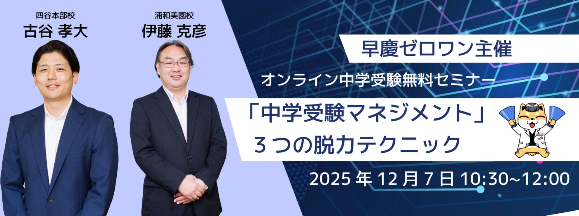 中学受験に取り組む多くのご家庭が抱える「親子のストレス」をテーマに、大学付属中学専門の個別指導塾「早慶ゼロワン」(所在地:東京都新宿区、代表:野田英夫)は、無料オンラインセミナー