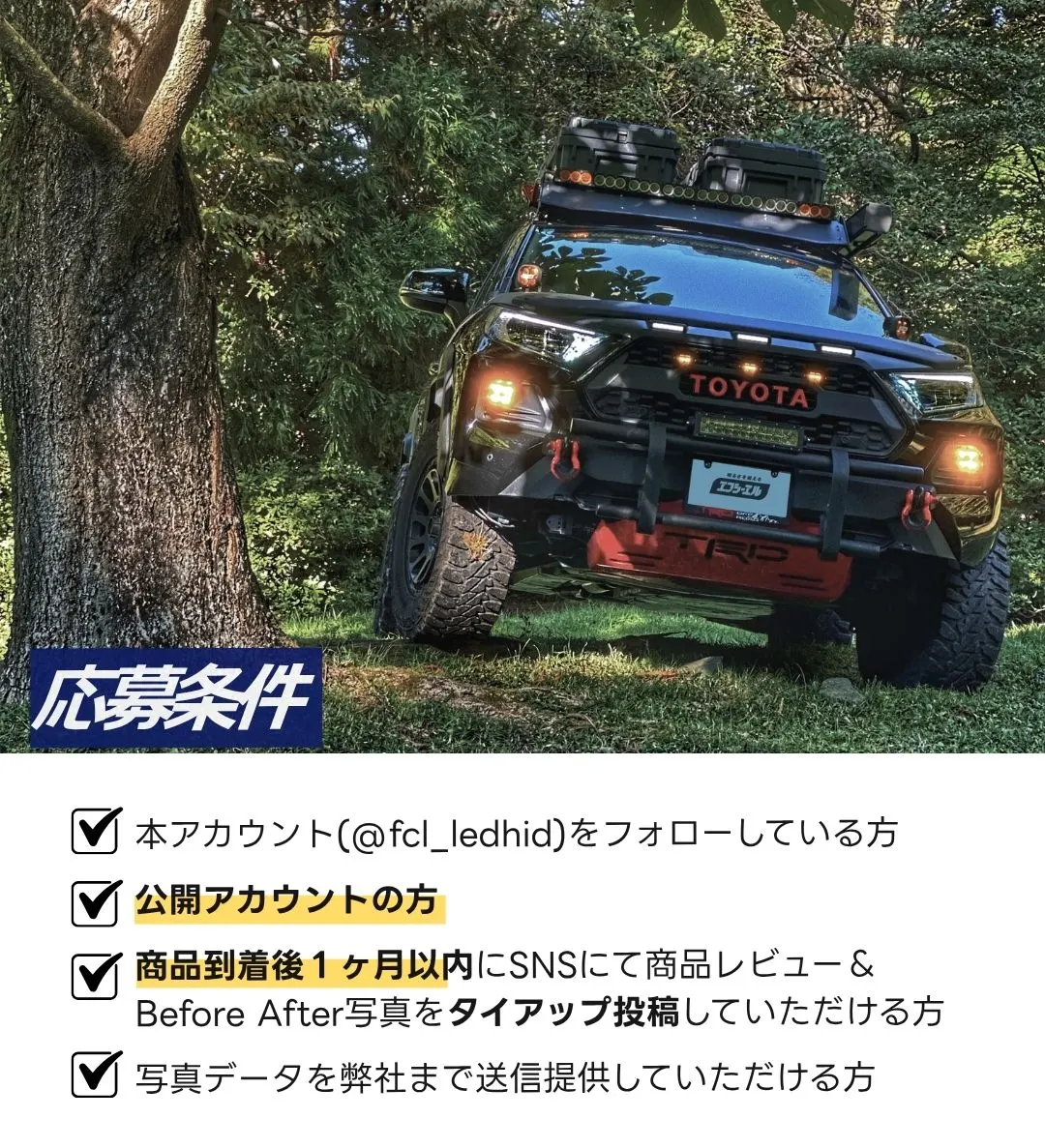 1. エフシーエル公式Instagram(@fcl_ledhid)をフォロー 2. 対象の投稿に「応募する」とコメント 3. DMに届く応募フォームより必要事項を記入 |