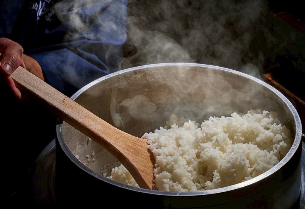巨大な羽釜で一気に炊き上げた