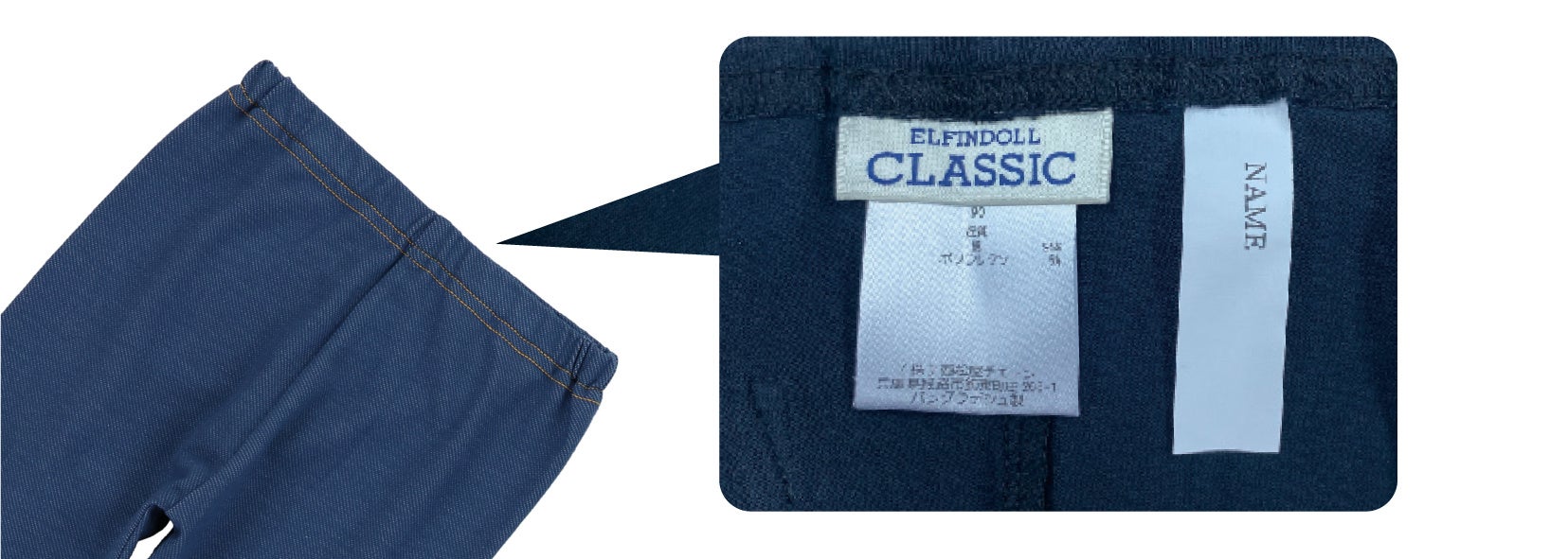 ウエストの内側に便利なお名前タグが付いており、園生活でも安心。保育士の方からも、お子さまの衣類管理や、着替えのサポートをするときに便利とのお声をいただいております。