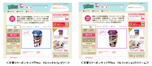 第一弾のキャンペーンとして、ピク メディア株式会社(本社:東京都渋谷区、代表取締役:森デイブ)が運営する日替りクーポンサイト「Piku」と連携し、「Piku」の会員向けにファミリーマートでグリコ ドロリッチと交換できる引換クーポン(2種)を先着各5,000名、合計10,000名にプレゼントするキャンペーンを実施します。当選対象のお客様は、「Piku」が発行した引換クーポン発行用のシリアル番号をファミリーマート店頭のFamiポートに入力して、発行されたクーポンと商品をレジに持ち込むことで、商品を入手することができます。