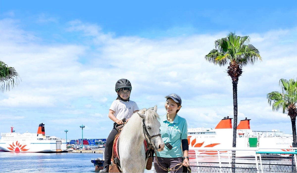 開放感のある南港の海辺で曳き馬でのポニー乗馬を体験します。