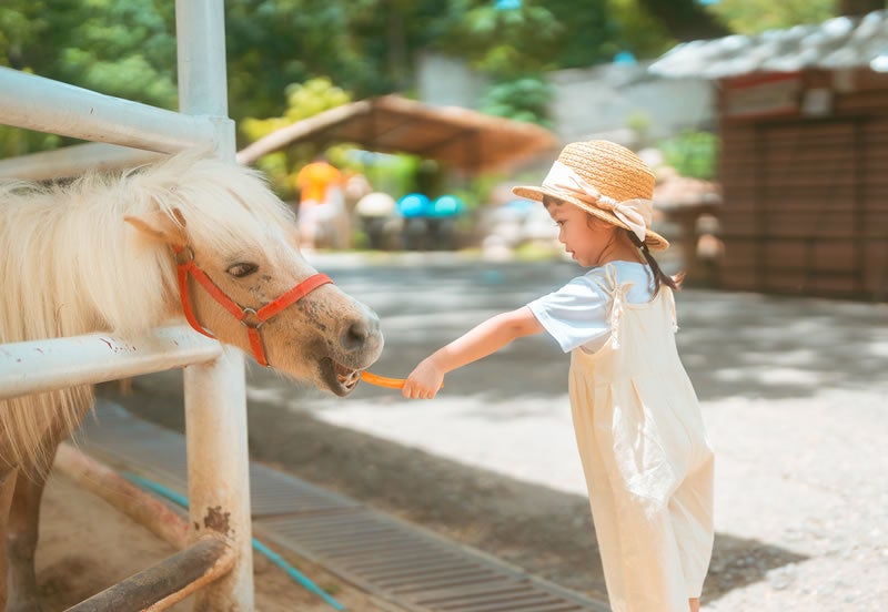 ポニー、サラブレッド、ミニチュアホースとのふれ合いや、体験乗馬、ポニーショーなどを楽しめます。