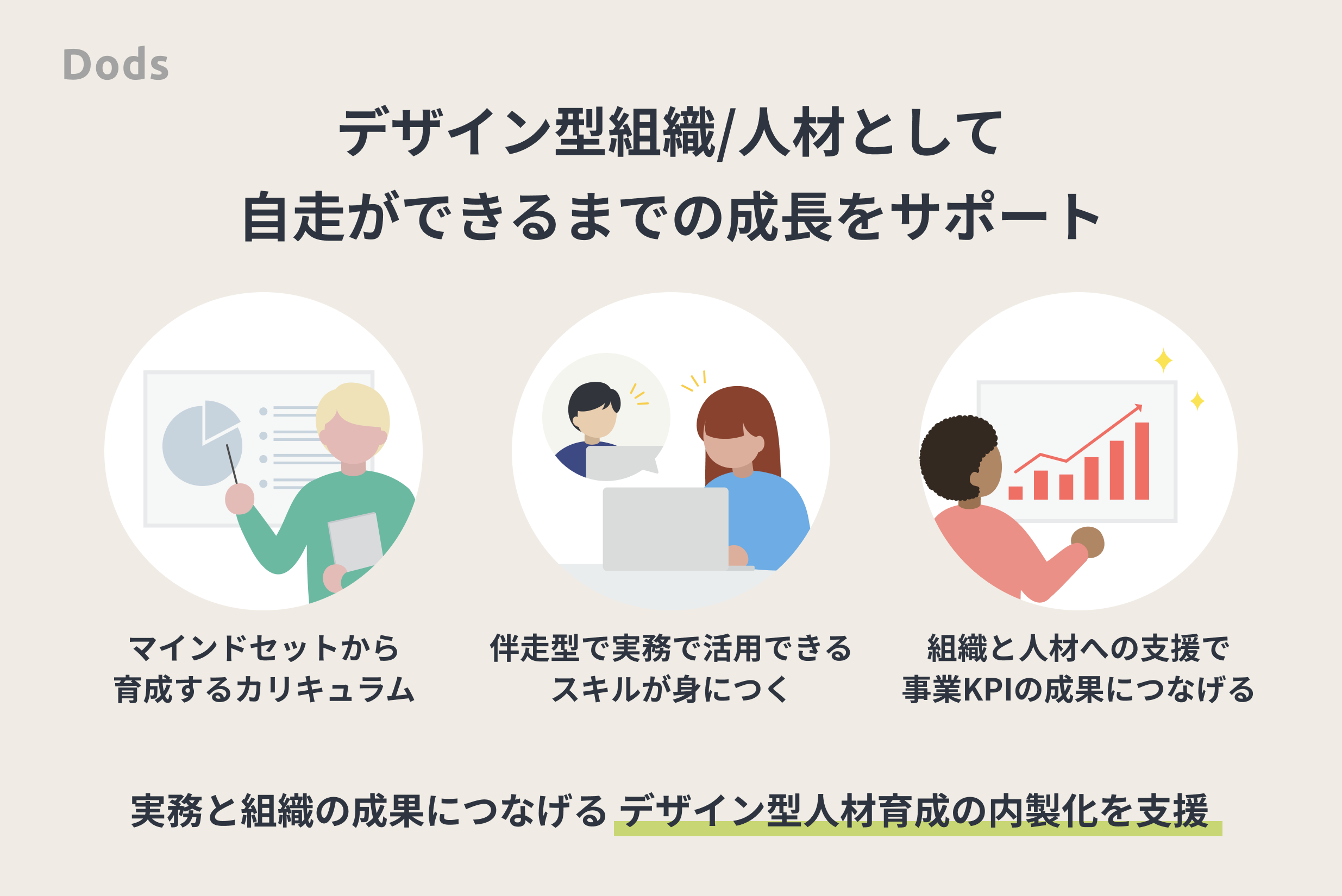 「Dods」は、自社や顧客の課題やニーズを特定し、解決できるデザイン型人材を必要としている企業様に向けたサービスです。