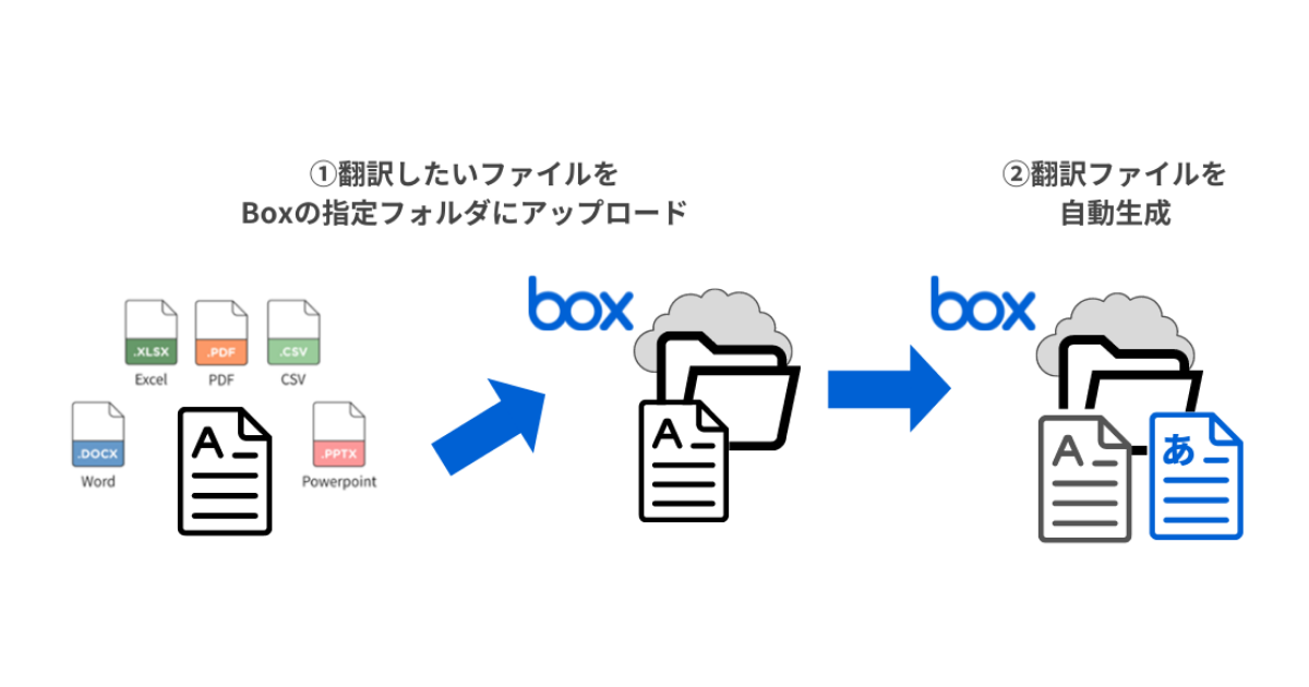 Boxから取り出すことなくそのまま翻訳が実行されるので、アップロードやダウンロードの手間なくそのまま共有が可能です