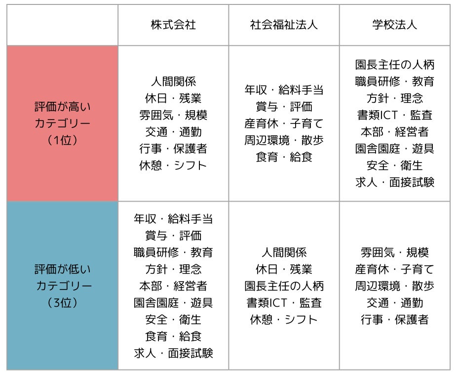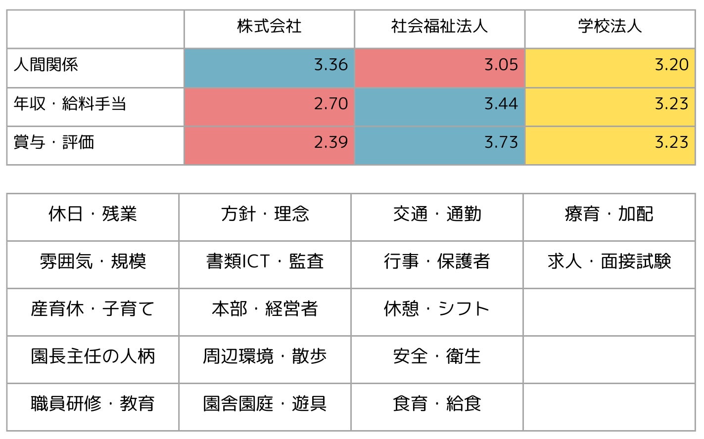 本調査では、全口コミの中から40代の保育士が投稿した口コミだけを調査対象とし、20個の口コミカテゴリーごとに、保育園・幼稚園を運営する「株式会社」「社会福祉法人」「学校法人」の評価点数を比較しています。そして、「1位(青色)」「2位(黄色)」「3位(赤色)」の色付けを行い、それぞれの職場の強み・弱みといった特徴を整理しています。(参考情報として公立の保育園・幼稚園を運営する「自治体」も公開)