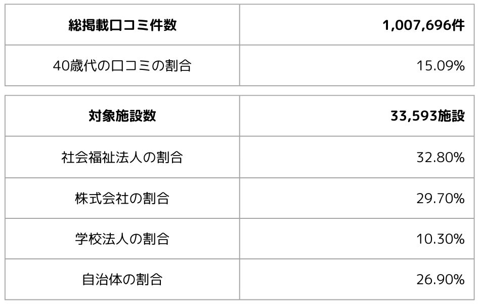 口コミ総掲載件数100万件の保育士職場口コミサイト『保育士のミカタ』は、40代の保育士が投稿した口コミ内容を分析し、保育園・幼稚園の職場のどんな点を評価をしていて、どんな点を評価していないのか40代保育士の実態調査を行いましたので、調査結果を公開いたします。