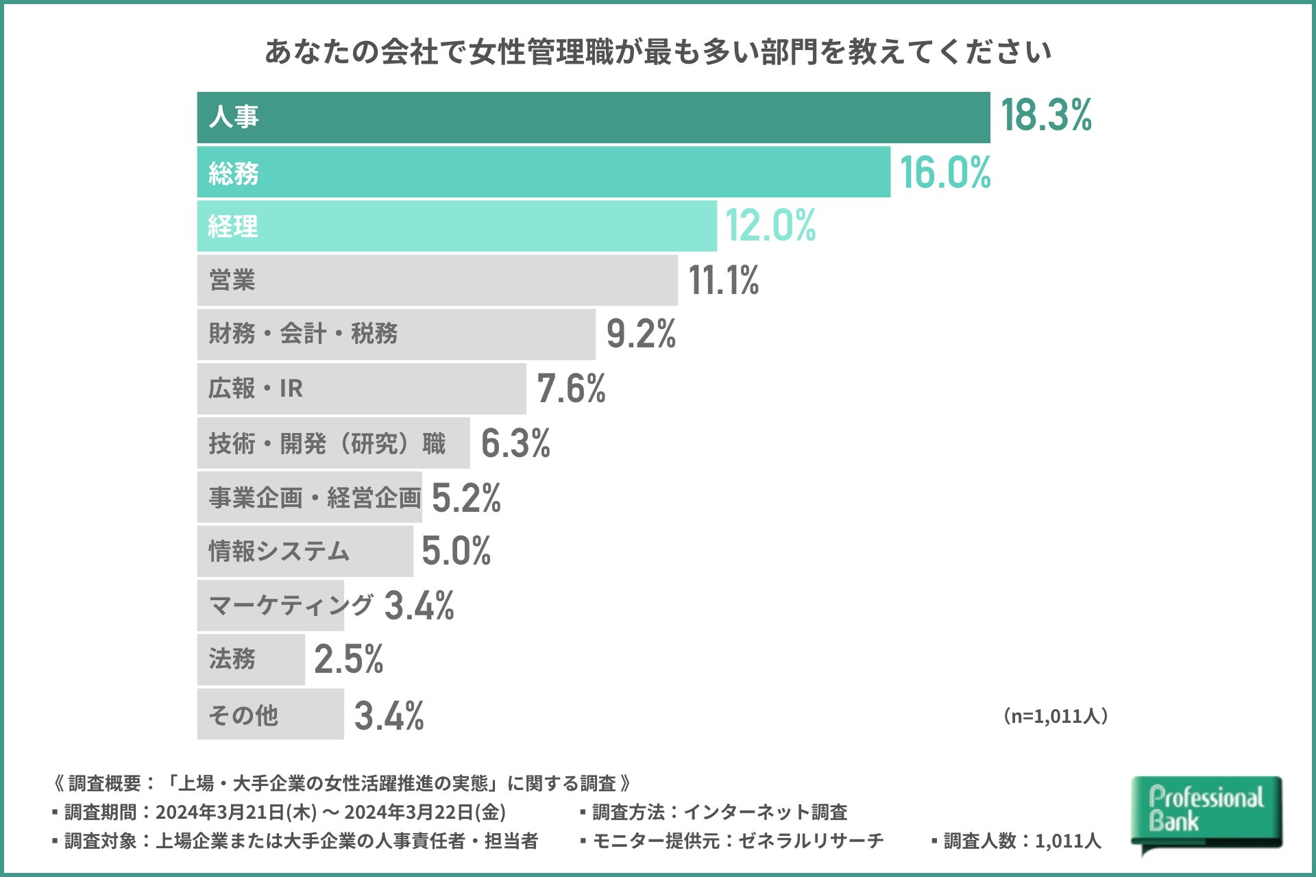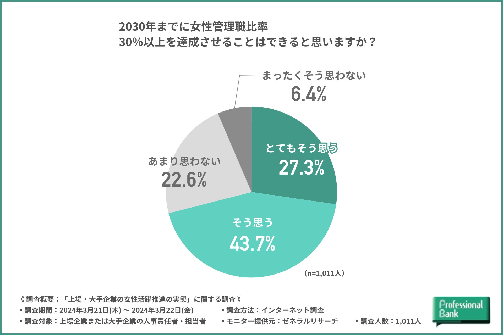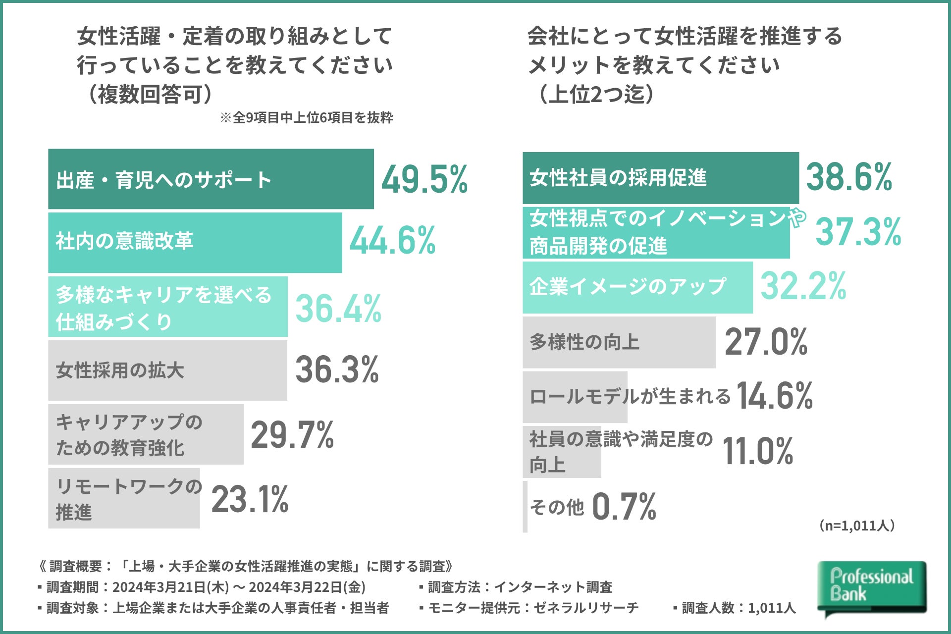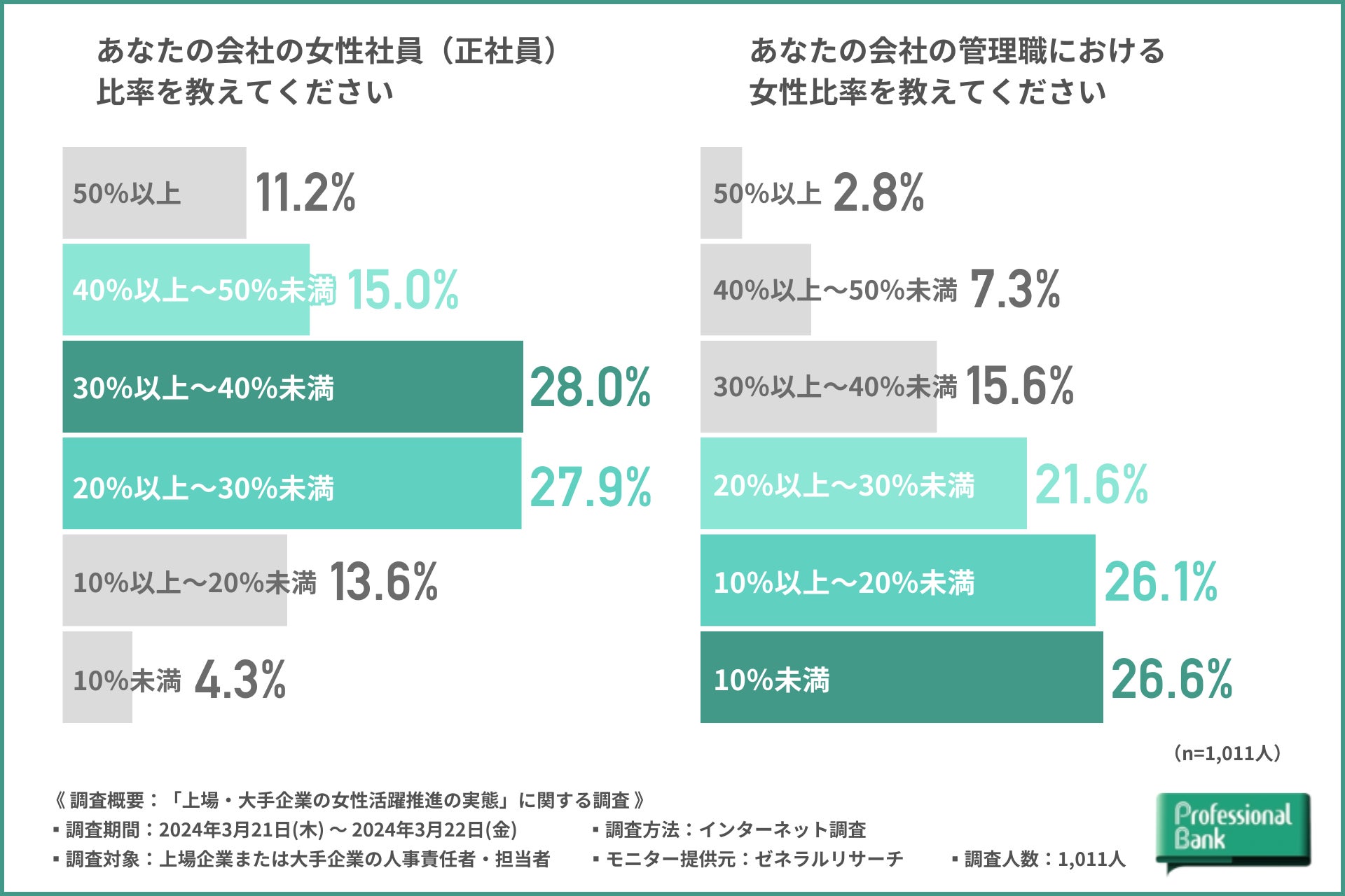株式会社プロフェッショナルバンク(本社:東京都千代田区/代表取締役社長:兒玉 彰)は、上場企業または従業員1,000人以上の大手企業の人事責任者・担当者を対象に、「上場・大手企業の女性活躍推進の実態」に関する調査を実施しました(有効回答数:1,011名)。