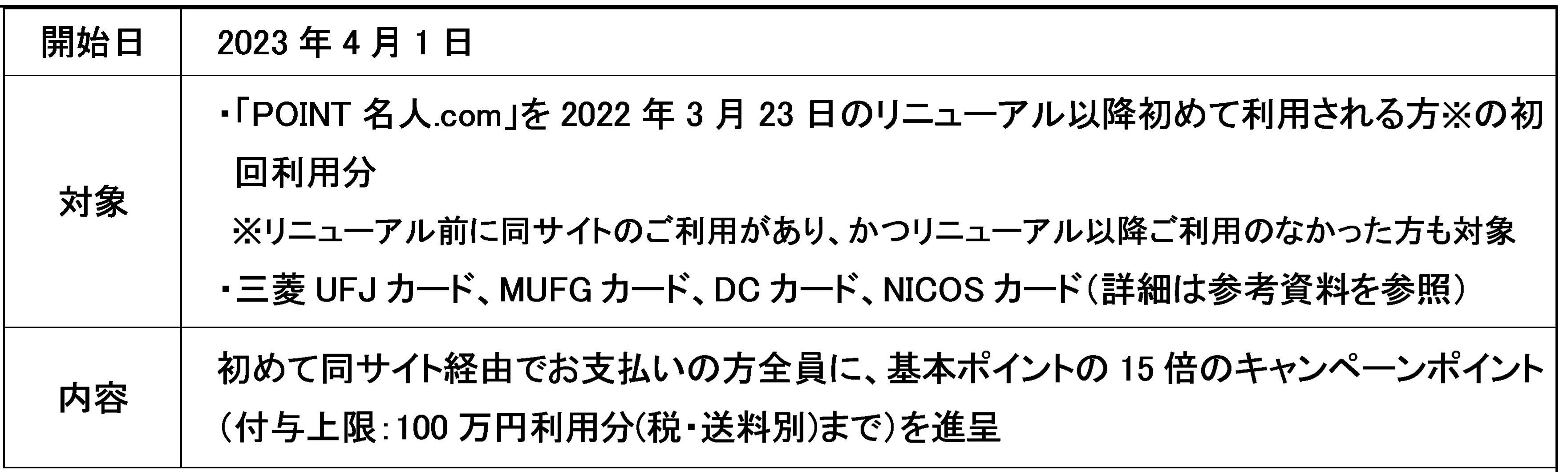 三菱UFJニコスは2023年4月1日に、三菱UFJカード、MUFGカード、DCカード、NICOSカードの会員(一部を除く)を対象に、カード会員向けポイントモールサイト「POINT名人.com」の初めての利用でもれなく基本ポイントの15倍のポイントがもらえ、最大で同40倍のポイントが貯まる企画を開始します。