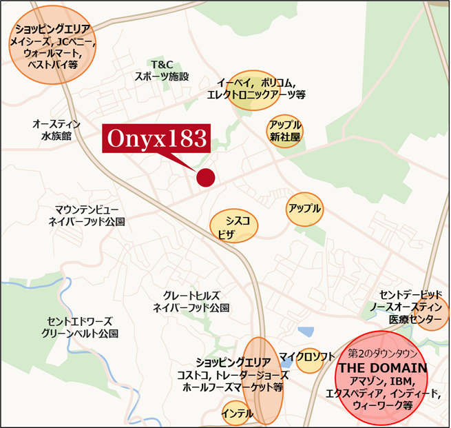 本案件が所在するオースティン北西エリアは、IBMの新たな拠点としても知られ、オースティン第2のダウンタウンとも称される複合商業施設“THE DOMAIN(ザ・ドメイン)”を擁するほか、本案件から車で約5分の位置にアップルの新社屋(キャンパス)が建設されており、生活利便性の高さのみならず、雇用集積地としても、今後のさらなる発展が期待されています。