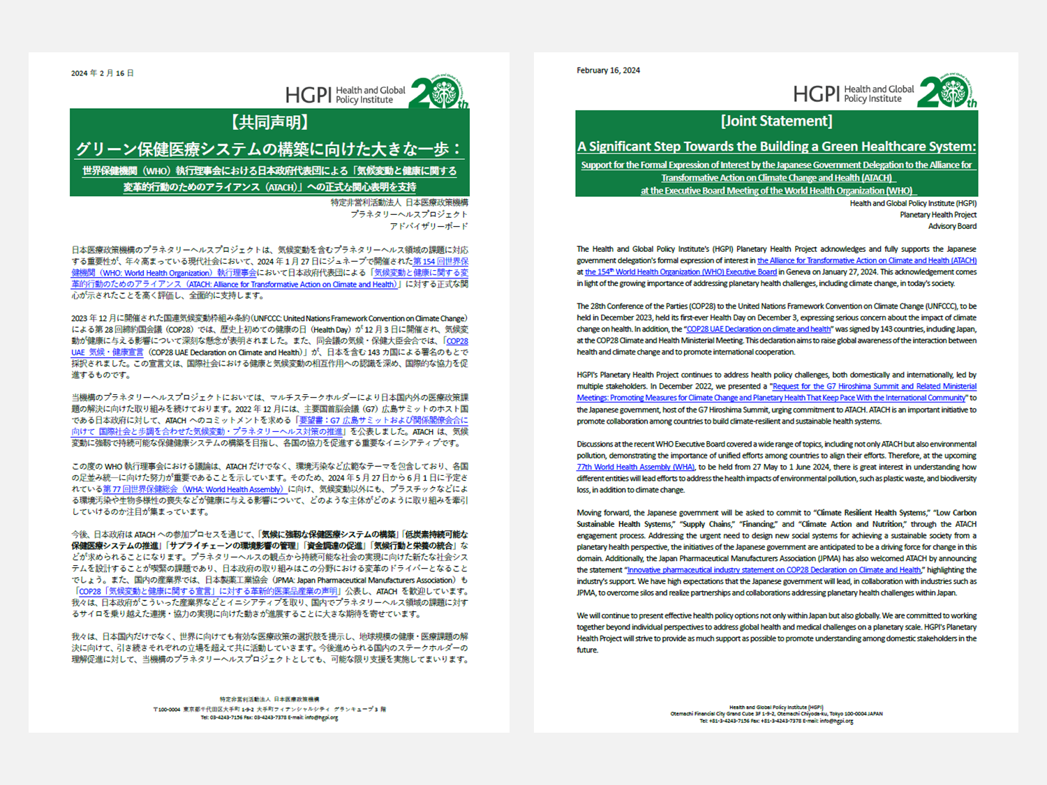 日本医療政策機構のプラネタリーヘルスプロジェクトは、気候変動を含むプラネタリーヘルス領域の課題に対応する重要性が、年々高まっている現代社会において、2024年1月27日にジュネーブで開催された第154回世界保健機関(WHO: World Health Organization)執行理事会 < https://www.who.int/about/accountability/governance/executive-board/executive-board-154th-session > において日本政府代表団による「気候変動と健康に関する変革的行動のためのアライアンス(ATACH: Alliance for Transformative Action on Climate and Health)」< https://www.atachcommunity.com/ >に対する正式な関心が示されたことを高く評価し、全面的に支持します。